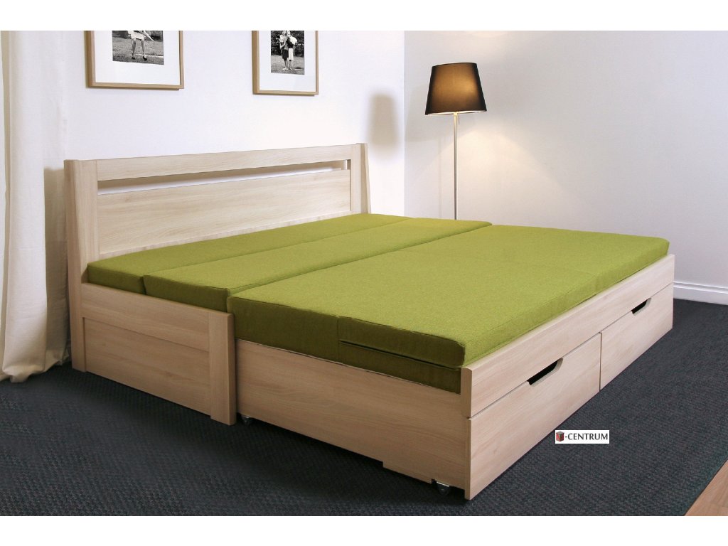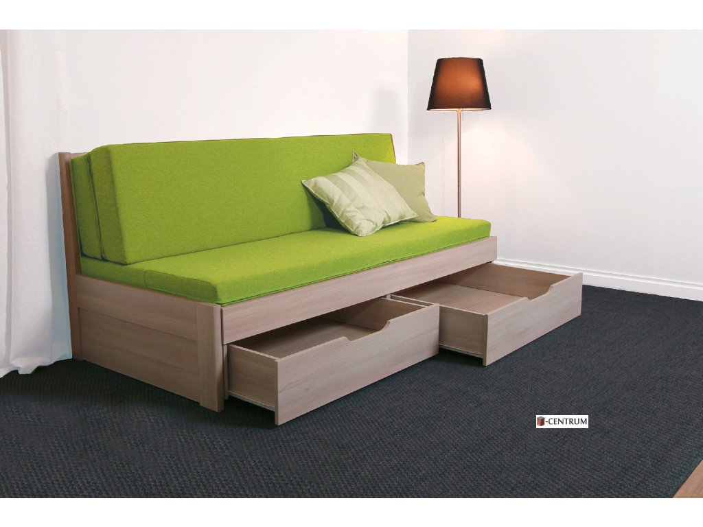 Rozkládací postel Klasik nabízí velký úložný prostor v podobě dvou oddělených zásuvek, které se dají nezávisle na sobě lehce a jednoduše vysouvat.
